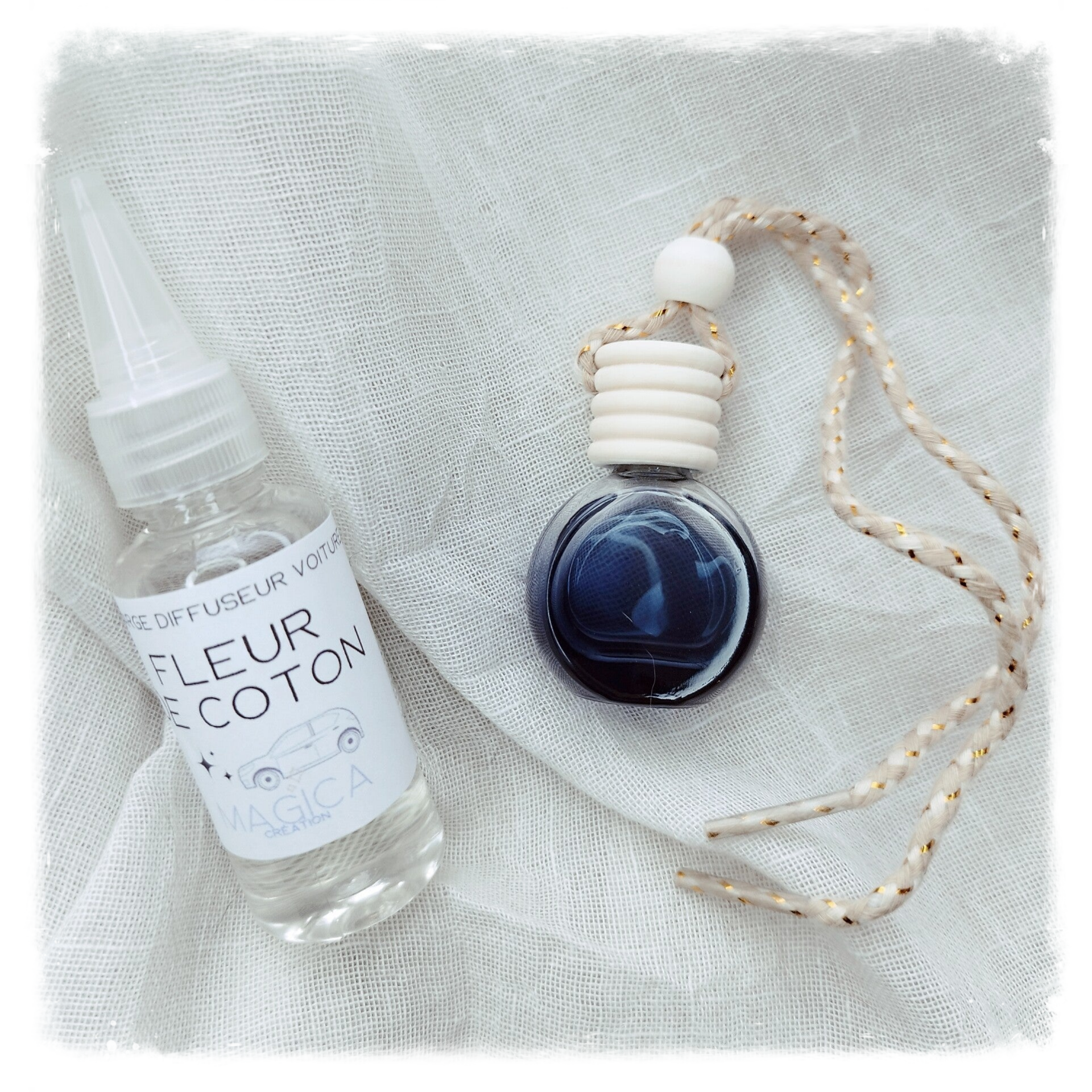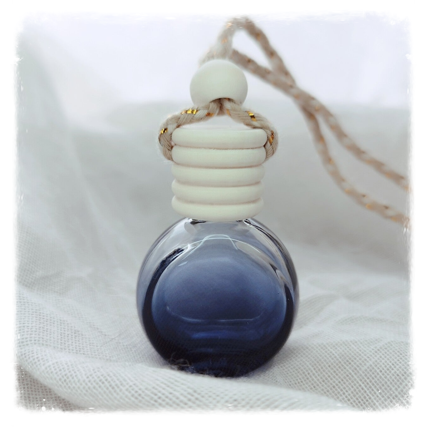 - accrocher la fiole dans votre voiture, veiller à serrer le nœud de façon à ce que le flacon se balance mais n'entre pas en contact avec le pare-brise.